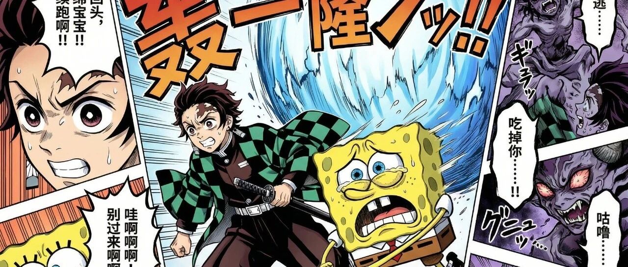 比如我又生成了一个中文的炭治郎和海绵宝宝一起玩的日文漫画。