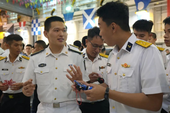 当越方参观官兵登上郑和舰,一句“同志,你好”快速拉近彼此距离。在舰艇参观环节,双方学员实地走访了停泊在港口的军舰,就舰艇装备、日常训练等专业内容进行了现场交流。