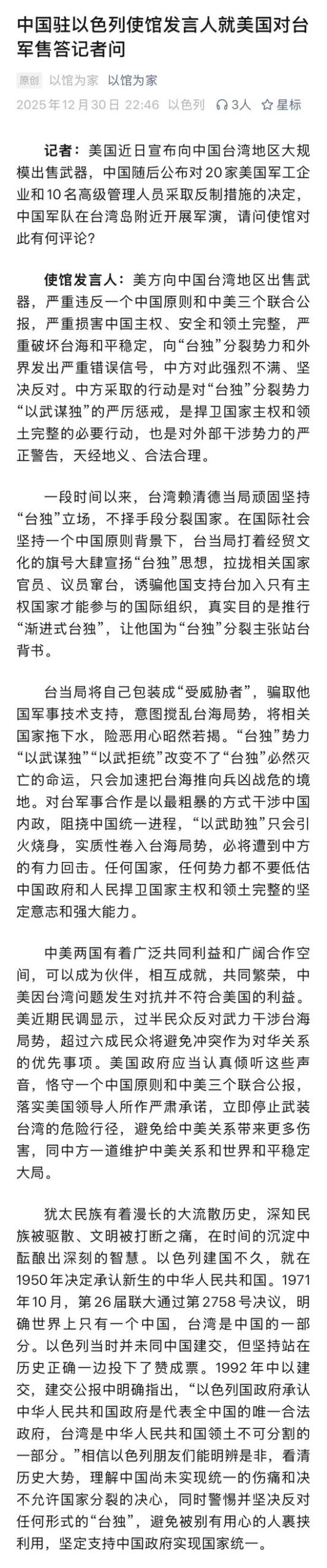 12月30日,中国驻以色列使馆发言人就美国对台军售答记者问。 https://finance.sina.com.cn/roll/2025-12-31/doc-inhervyw3808792.shtml 参考资料WhatsApp网页版 文章导航 欧洲又现离奇劫案:窃贼打洞进入银行金库 整个周末都在开箱闫学晶哭穷翻车:一顿11个菜,儿子也被她坑惨了