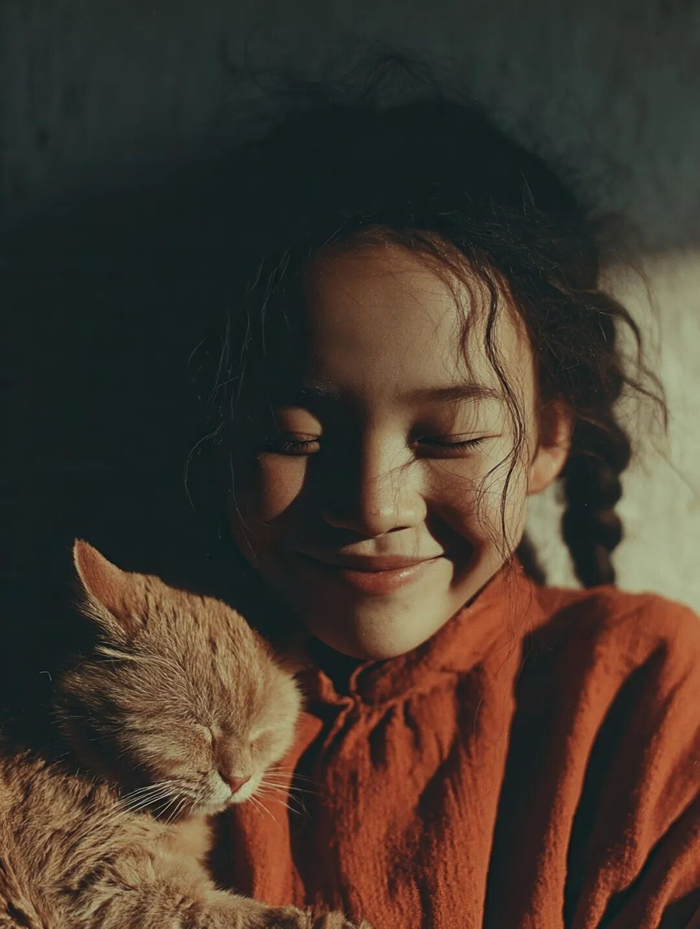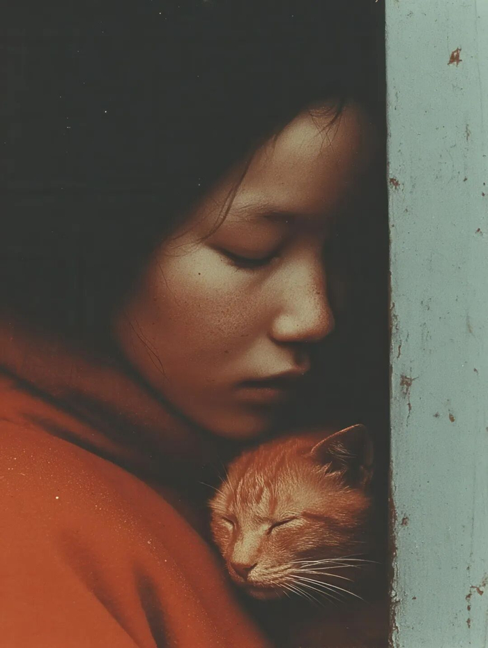 Prompt:Ga chinese girl with a fat cat in her arms, shot on KODAK Analog Film Camera, cinematic –chaos 33 –raw –sref 381085082 117225988 3759023376 4094373978 –ar 3:4 –p –s 1000–v7.0