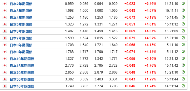 日本国债跌疯了。刚刚,日本各期限国债收益率皆出现暴涨行情,40年和10年期限均创下阶段历史。
