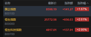 今日港股三大指数集体高开,恒指开盘涨2.61%,报25772.56点,恒科指涨2.95%,国企指数涨1.67%。盘面上,科网股普涨,哔哩哔哩涨超5%,网易、百度、腾讯涨超3%;黄金股高开,中国黄金国际涨超7%;AI应用股普遍上涨,智谱涨超14%;汽车股活跃,蔚来涨超3%;油气股走弱,山东墨龙跌超14%。