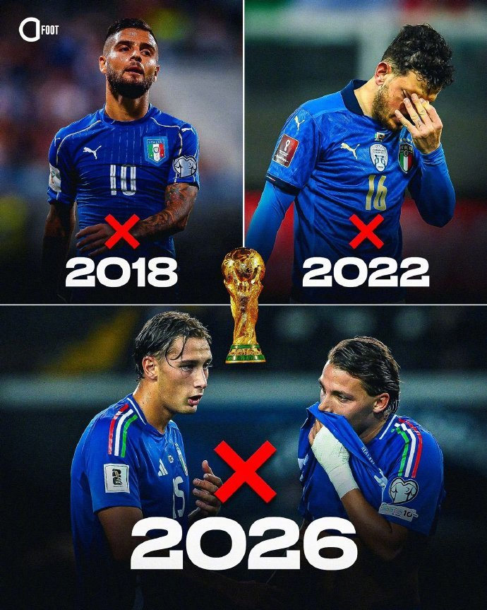 意大利连续3届世界杯未能在预选赛中出线,他们是首支连续无缘三届世界杯的前冠军球队。(直播吧)