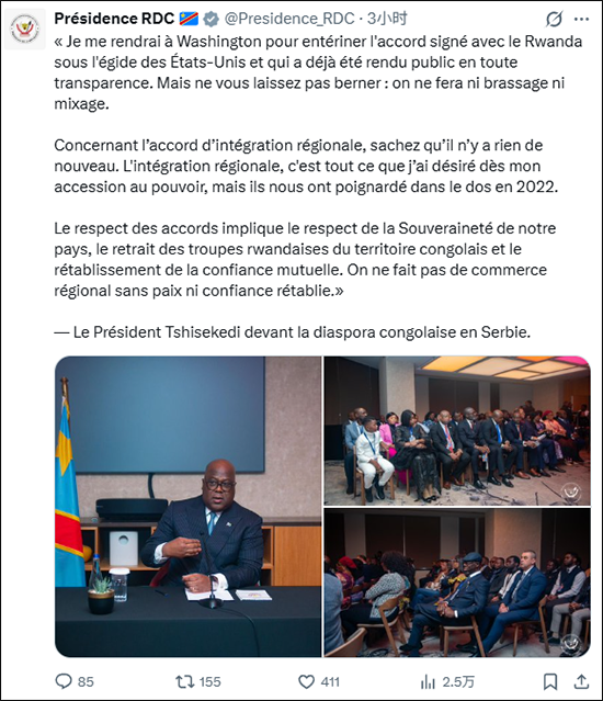 刚果(金)总统齐塞克迪随后在X平台上发文,确认将亲自赴美签署协议,并强调“协议内容将清晰明确,不容混淆或掺杂”。他同时指出,卢旺达军队必须从刚果(金)东部撤出,地区经济一体化才能取得实质性进展。