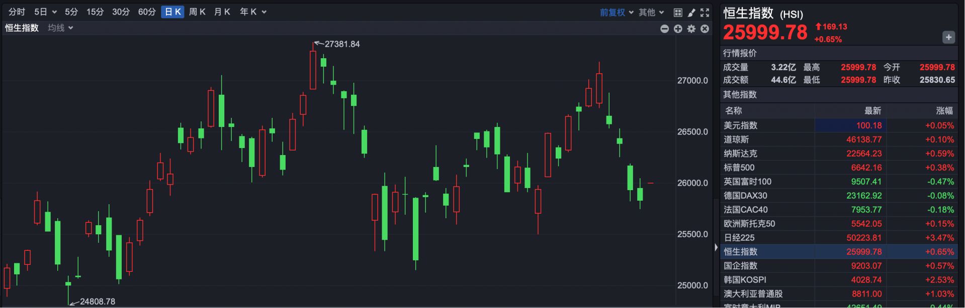 截至发稿,恒生指数报25999.78点,上涨169.13点,涨幅0.65%。