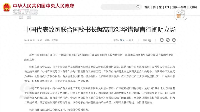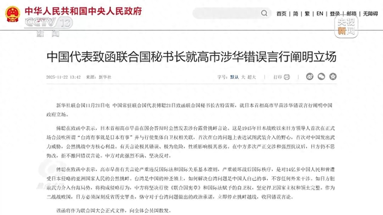中国常驻联合国代表傅聪11月21日致函联合国秘书长古特雷斯,就高市早苗涉华错误言行阐明中国政府立场:如日方胆敢武力介入台海局势,中方将坚定捍卫国家主权和领土完整。高市的涉台错误言论粗暴干涉他国内政,更对中日关系和地区稳定造成直接的冲击。
