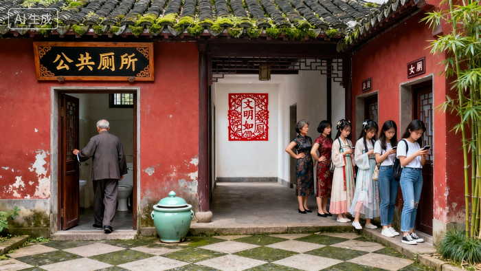 第一步,找隔间 + 开门!女生小便必须进隔间,不能像男生那样站着解决,所以首先得找空隔间,要是高峰期,隔间全满,只能排队等!好不容易等到隔间,还得掏手机扫码(现在很多公共厕所是智能门锁)、拧门把手,开门又得花几秒!