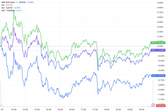 截至收盘,道琼斯指数跌0.61%,报47,417.27点;标普500指数跌0.08%,报6,775.80点;纳斯达克指数涨0.08%,报22,716.13点。
