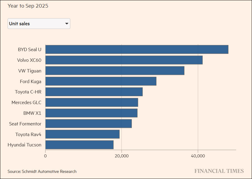 施密特汽车研究公司的统计数据显示,比亚迪Seal U已成为欧洲地区销量最高的插电混动汽车,2025年前九个月的市场份额约为5.5%。在英国地区,奇瑞Jaecoo 7是8月最畅销的插电混动车型。