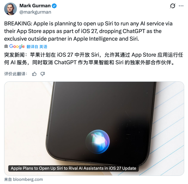 苹果iOS 27开放Siri接入任意AI服务,ChatGPT独家地位终结