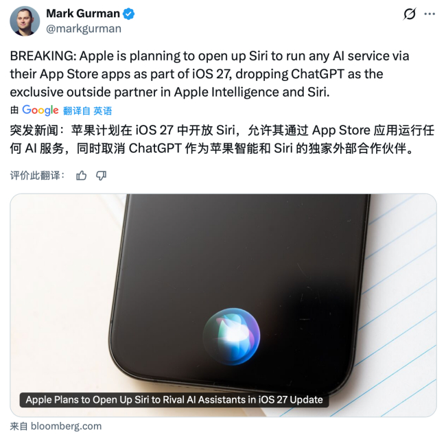 此前,苹果与OpenAI达成合作,ChatGPT在系统层面作为Siri处理复杂指令的默认外部后端,享有独家身份。如果此次调整落地,Gemini、Claude乃至国内的各类大模型,理论上都能以同等方式进入Siri的调用链路。