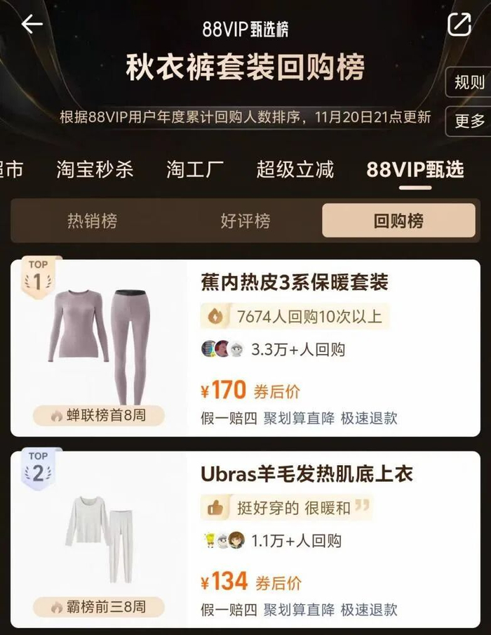 今年双十一,蕉内表现优秀,拿下了秋衣裤套装回购榜单第一。