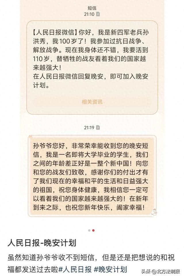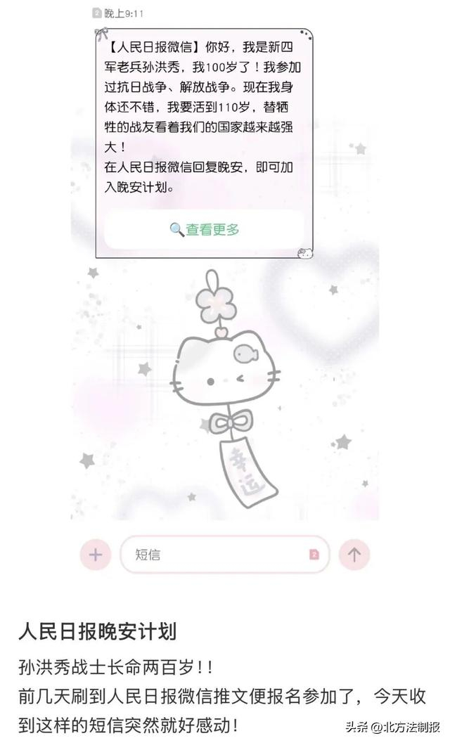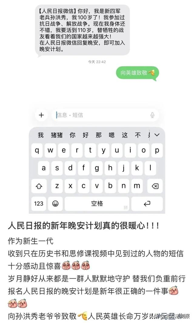 有网友收到短信后十分感动:“收到了只在历史书上见到的人的短信。”还有网友感慨:“我们的年龄差正好是新中国的年龄。”更多网友为老英雄送上祝福:“长命两百岁!”“身体健康,一切安好!”