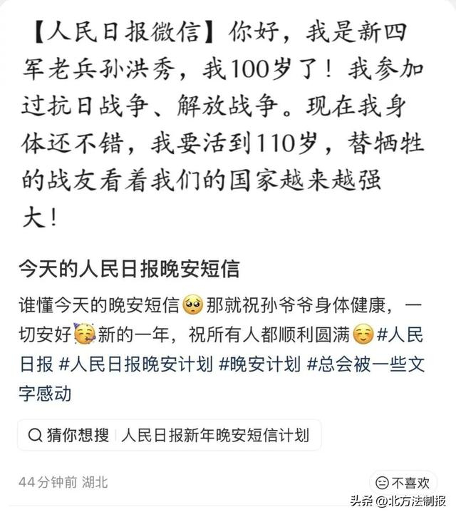 昨晚,来自一位100岁抗战老兵的这条短信让许多网友为之动容。