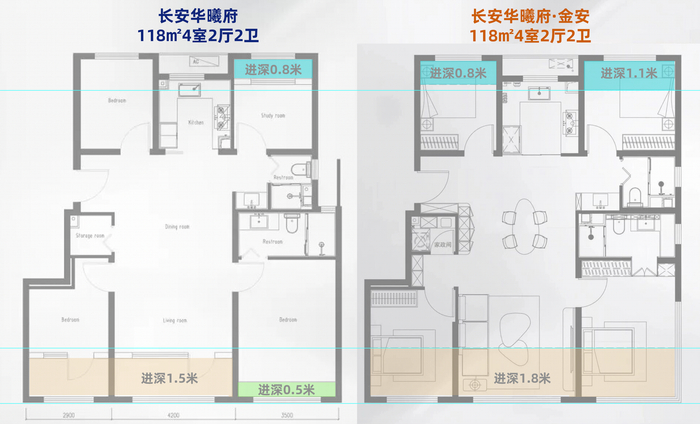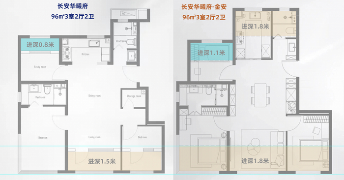 南向阳台进深由1.5米增加到1.8米;北向设备平台进深由0.8米扩大到1.1米。