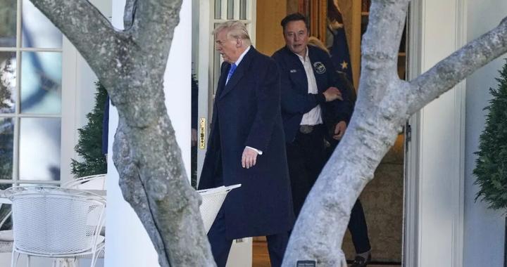 2025年3月21日,在美国华盛顿,马斯克(后)和特朗普一起离开白宫(资料照片)。 新华社/美联