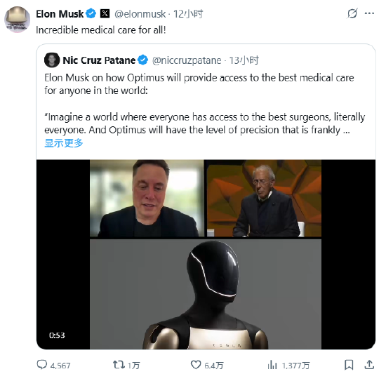 针对网友的分享,马斯克回应称:“为所有人提供不可思议的医疗服务!”