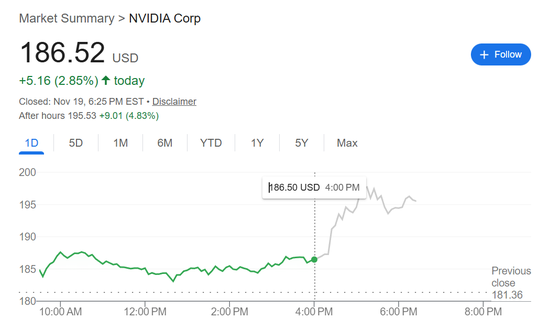 财联社11月20日讯(编辑 刘蕊)美东时间周三盘后,美股“AI”领头羊英伟达公布了第三季度财报。这份财报业绩本身几乎可称“完美”:不仅在营收和盈利方面均超出分析师预期,并且给出了超出预期的前景展望。公司股价也在盘后上涨,截至发稿涨幅为4.84%。