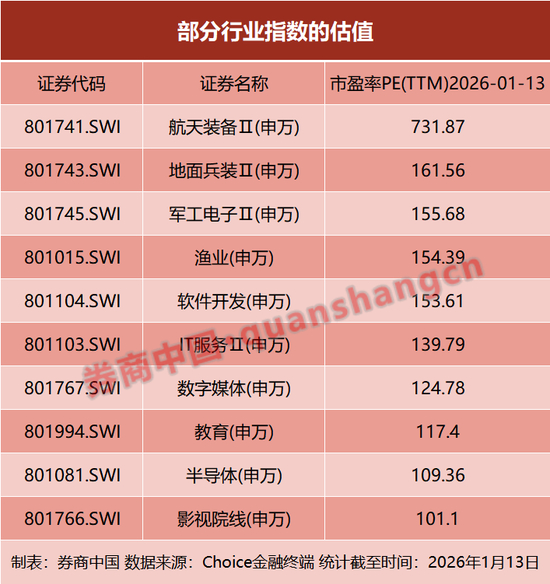 自2024年9月24日至2026年1月13日,科创50和科创100指数的涨幅均超过120%,而中证2000指数涨幅也接近1倍。这三只指数的估值也均超过百倍。截至1月13日,科创100和科创50指数的市盈率分别为217倍和172倍,中证2000指数的市盈率为164倍。