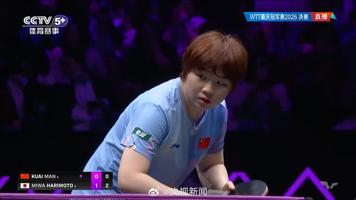 据央视新闻微博消息,2026 WTT重庆冠军赛女单决赛中,蒯曼以3比4惜败给日本选手张本美和,获得亚军。